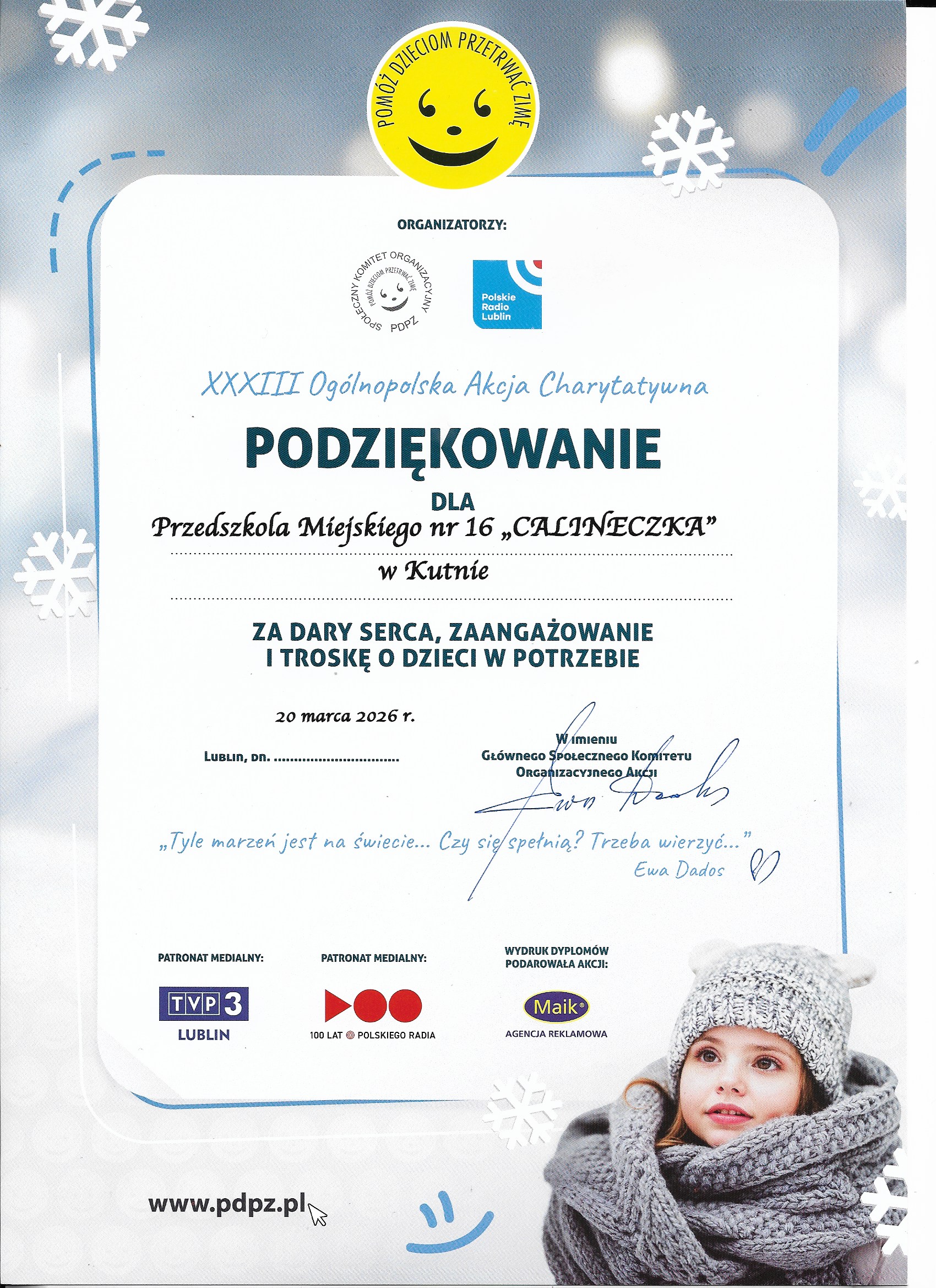 - za dar serca , zaangażowanie i troskę o dzieci w potrzebie w akcji POMÓŻ DZIECIOM PRZETRWAĆ ZIMĘ [.jpg, 1016.88 kB]